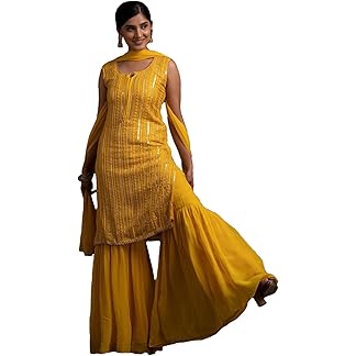 INDO ERA Women’s Silk Blend Floral Embroidered A-line Kurta Palazzo with Dupatta Set