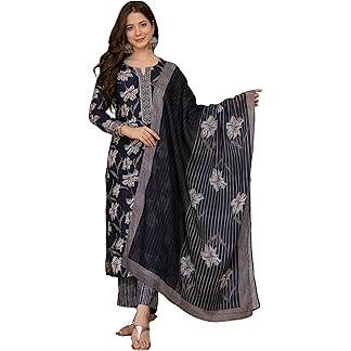INDO ERA Women’s Silk Blend Embroidered A-Line Kurta Pant with Dupatta Set