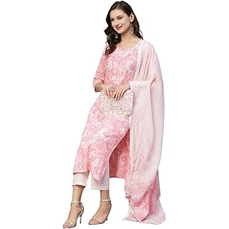 GoSriKi Women’s Cotton Blend Straight Printed Kurta with Pant & Dupatta