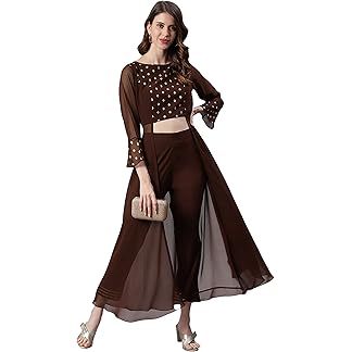 Janasya Women’s Brown Georgette Ethnic Motifs Top with Pant