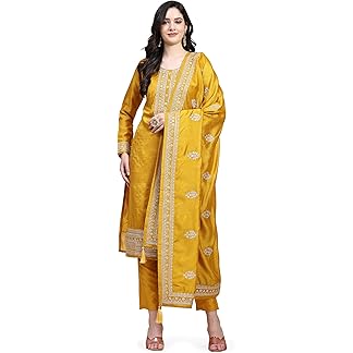 TRENDMALLS Women’s Vichitra Silk Embroidery Salwar Suit Set Kurta Pant with Dupatta Yellow Kurta Set for Women