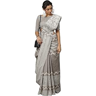 SAMAH Women’s Cotton Blend Geometric Printed Zari Stripe Saree with Unstitched Blouse Piece