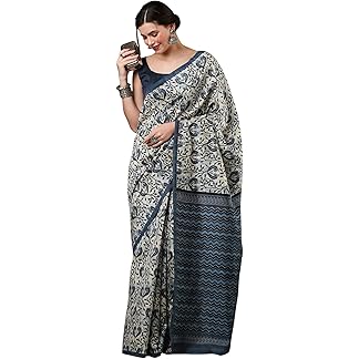 AKHILAM Women’s Ajrak Block Print Dola Silk Saree With Unstitched Blouse Piece