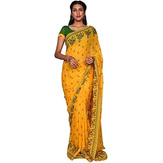 HESVI Women’s Georgette Saree with Unstitched Blouse Piece and Hand-Embroidered Gota Work Lucknowi Chikankari