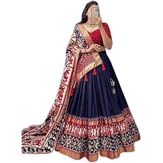 Red X Enterprise Women’s Tussar Silk With Patola Print And Foil Work Lehenga choli (NAVYBLUE1)