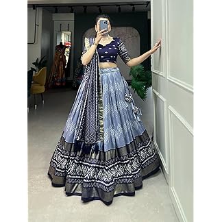 Women,s Tussar Silk With Leheriya And Foil Print Lehenga choli Set (BLUE)