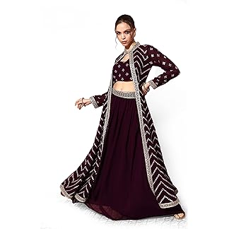 LYMI LABEL Lehenga Shrug Set For Women – Wine Georgette Zari Sequence Embroidered Lehenga Choli With Shrug For Wedding, Function, Ethnic Wear