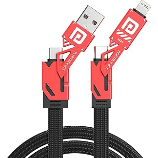 Portronics Procharge 4 60W 4-In-1 Multifunctional Fast Charging Cable With Multiple Port & Metal Zinc Alloy Head, Tangle Free Flat Cable, Type C to Type C/Lightening, USB A, Fast Data Sync (Red+Black)