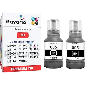 Ravaria 005 Black Ink for Epson M1050 M1100 M1120 M1140 M1170 M1180 M2050 M2110 M2120 M2140 M2170 M3140 M3170 M3180 (005 Black Ink 2 Pcs Pack)