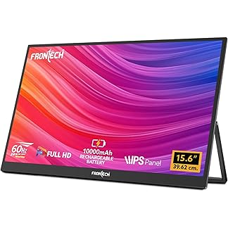 FRONTECH 15.6″ Portable LED Monitor, Full HD IPS Display, 10000mAh Rechargeable Battery, Dual Type-C & Mini HDMI, Built-in Speakers, 180° Stand, Works with Laptop/PS5/Switch/Phone (MON-0023P)