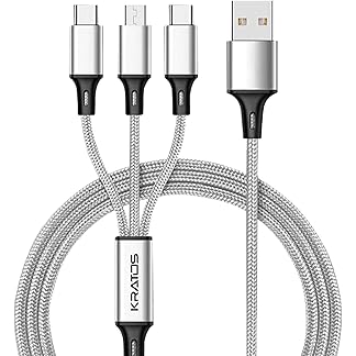 Kratos Unbreakable 1.2 Mtr 3 in 1 Charging Cable with Nylon Braided Long Life Multi charger cable fast charging for lighting, Type C and Micro USB ports, Fast charging cable for Smartphones & Tablets