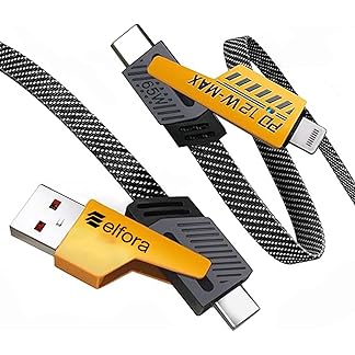 Elfora 4 in 1 Braided Fast Charging Cable 65W | Quad 1.5m Rugged Design Multiport | Type C to Lightning | Type C to USB A | Compatible for iPhones, iPads, Tablets, MacBooks and Android Devices -Black