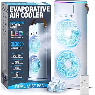 Drumstone 𝟏𝟓 𝐘𝐞𝐚𝐫𝐬 𝐖𝐚𝐫𝐫𝐚𝐧𝐭𝐲 4000mAh Rechargeable Double Spray Fan, Cold Air Desk Fan with 280ml Tank, 3 Wind & Spray Modes, USB-C, Remote Control, 7-Color LED Light, Ice Water Cool Mist