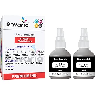Ravaria BT-D60BK / BT6000 and BT5000CMY Compatible Ink for Brother Printer T220, T420, T520, T820, T920, T510, T910, T710, T4000W, T4500W, T300W, T800W (BT-D60BK / BT6000 Black 2 Pcs Pack)