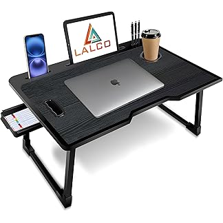 Laptop Table Study Table Premium Foldable Wooden Mini Laptop Table for Bed, Smart Study Table with Drawer, Tablet/Mobile/Cup Holder for Kids & Adults (COTTED~Black)