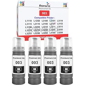 Ravaria 003 Compatible Ink for Epson Printer L1110 L3100 L3101 L3110 L3115 L3116 L3150 L3151 L3152 L3156 L5190 (003 Black Ink 4 Pcs)