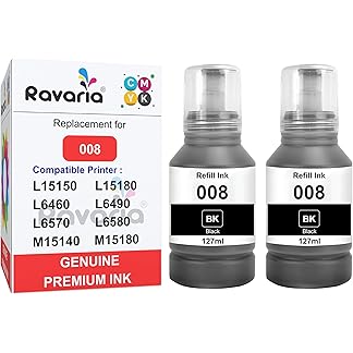 008 Compatible Ink for Epson Printer L15150, L15180, L6460, L6490, L6570, L6580, M15140, and M15180 (008 Ink Black 2 Pcs)