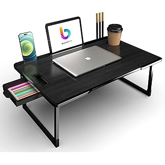 mankita Foldable Wooden Mini Laptop Table for Bed, Study Table with Drawer, Tablet/Mobile Holder for Kids & Adults (BLACK COTTED)