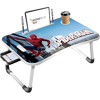 WONDWILD Premium Foldable Wooden Mini Laptop Table for Bed, Study Table with Drawer, Tablet/Mobile Holder for Kids & Adults >> (C Bidding Spiderman)