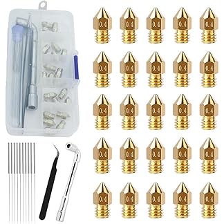 Serplex® 0.4MM MK8 Brass Nozzles for 3D Printer, Includes 25pcs MK8 Brass Nozzles, 10pcs Cleaning Needles, Tweezers, Wrench and Storage Box, Compatible with Creality Ender 3/Ender 3 Pro/CR 10 Series