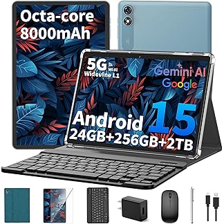 QDDQ 2025 Android 15 Tablet with Keyboard, 24GB + 128GB + 2TB Expansion, 10.1″ Octa-Core 2-in-1 Tablets with 5G/2.4G WiFi, 8000mAh, BT5.0, GMS Certified, with Mouse, Case, Pencil