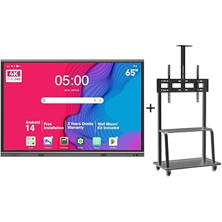 BIG VUE 65 Inches Android 14 Smart Interactive Digital Board, Flat Panel with Adjustable Height Rolling TV Cart | 8GB RAM 128GB ROM | Multitouch Screen Display for Teaching and Office Use