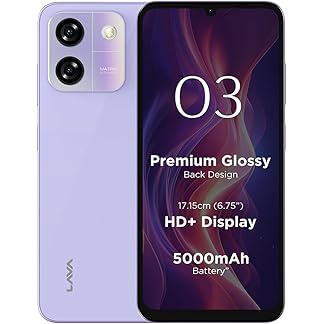 Lava O3 (Glossy Lavender, 4 GB RAM, 64 GB Storage) | Biggest 6.75″ HD+ Display | 13MP AI Dual Rear Camera | 5000 mAh Battery | Secure Face Unlock | Fingerprint Reader | Charger & Phone-Cover in Box