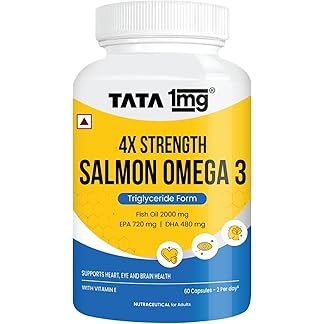 Tata 1mg Salmon 4X Omega | Omega-3 Fish Oil for Heart, Eye & Brain Health | 2000 mg Salmon Fish Oil, 720 mg EPA, 480 mg DHA | 60 Capsules