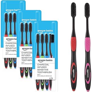 Amazon Basics Charcoal-Infused Sensitive Toothbrush for Adults, Multicolour | 12-Count (4 × 3 Packs) | Ultra Soft Bristles for Deep Cleaning, Whitening & Gentle Gum Care