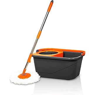 Bonkaso Spin Mop with Stainless Steel Wringer & Big Wheels | 360° Rotating Mop, Adjustable Handle | Easy Floor Cleaning Bucket Set with 2 Microfiber Refills – Grey & Orange (46 x 26.5 x 23 cm)