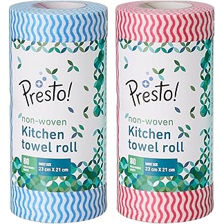Amazon Brand – Presto! Non-Woven Kitchen Towel Roll | 80 Pulls (Pack of 2) | Size: 23 x 21 cm | Wavy Pattern (Red & Blue) | Washable and Reusable | Highly Absorbent | For Daily Use