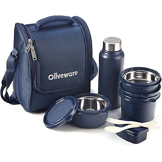 SOPL-OLIVEWARE Teso Lunch Box With Plastic Cutlery,3 Microwave Safe Inner Steel Containers With Bpa Free Lids(290Ml,450Ml&600Ml)Plastic Pickle Box(130Ml)Steel Water Bottle(750Ml)-Blue,290 Milliliter