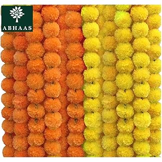 ABHAAS 10 Pcs Indian Handmade Artificial Marigold Garland Flowers for Decoration Long for Door Decoration Toran Genda Phool for Wedding/Festivals|4.2-4.9Ft| 5 Yellow + 5 Orange|10 Strings