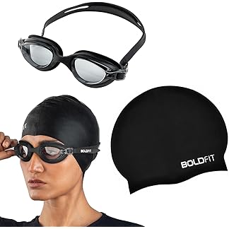 Boldfit Swimming Cap & Goggles Set for Men Unisex Swimming Cap for Men & Swimming Goggles for Men Set Silicone Swimming Cap for Women with Goggles Set Adjustable Strap for Training Swim Set Black