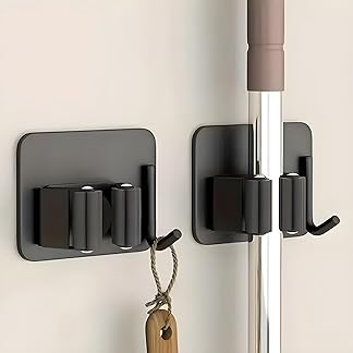 JIALTO 2 Pieces Stainless Steel Broom Holder with Hook – Wall-Mounted Adhesive Waterproof Rustproof Heavy Duty Broom and Mop Stick Holder for Home, Kitchen,