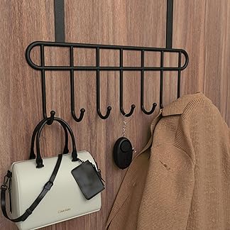 JIALTO Steel Over The Door Hook Hanger, Hanging Organizer Rack with No Hole Drilling Required for Bedroom, Bathroom & Kitchen Doors of Shirts, Belts, Towels with 7 Hook Rack (1 Black)