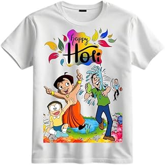 Celebrate Holi with Chota Bheem and Nobita Printed Unisex Half Sleeve Round Neck White Tshirts for Kids|White Polyotton Round Neck Kids Unisex Girls|Boys|Men Half Sleeve T-Shirt