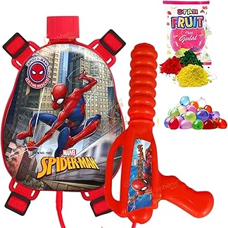 GRAPHENE Red Holi Pichkari Water Gun for Kids 500ml Back Holding Water Tank Pichkari High Pressure 1 Pkt Gulal & 100 Water Balloons Spider Man Water Spray Pistol Gun ISI Approved