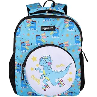 Amazon Basics Trendy and Spacious Dino Theme Kids Backpack | Comfortable Padding | 14 Inches (Sky Blue)