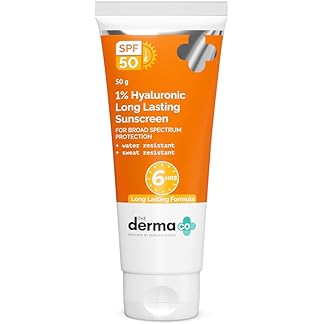 The Derma Co 1% Hyaluronic Long Lasting Sunscreen SPF 50 PA++++ with Hyaluronic Acid & Vitamin E for Broad Spectrum Protection- 50 g | 6 Hrs. Sun Protection | Water & Sweat Resistant | No Reapplication Needed