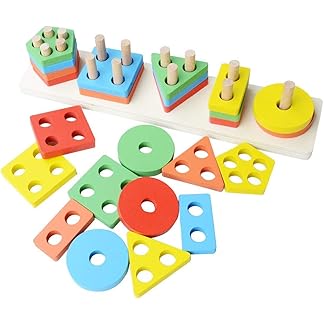 Toyshine Kids Wooden Angle Geometric Blocks Stacker Shape Sorter Column Puzzle Stacking Set – 5 Columns