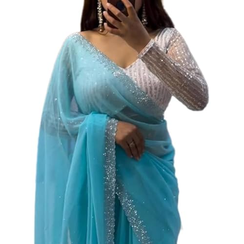 3S STAR Womens New Latest Georgette Hot Fixing Swaroski Stone Work Designer Saree with Fancy Blouse | Sarees For Womens & girls