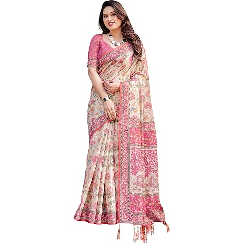 ALMAARI FASHION Handloom Cotton Floral Printed Saree with Tassels on Edges & Attached Blouse Piece | 5.5 Meter Saree + 0.8 Meter Blouse