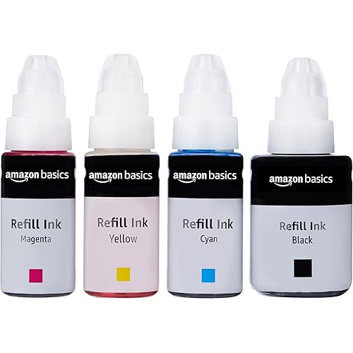 amazon basics GI 790 Ink Refill for Canon PIXMA G1000, G1010, G1100, G2000, G2002, G2012, G2100, G3000, G3010, G3012, G3100 Printers Ink|Perfect Compatibility|Leak-Proof (Black, Yellow, Cyan, Magenta)