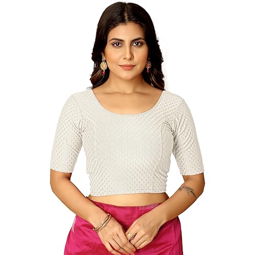 405931 reviews for Amazon Brand – Anarva Round Neck Dobby Cotton Lycra Stretchable Elbow Half Sleeve Readymade Saree Blouse for Women Stylish