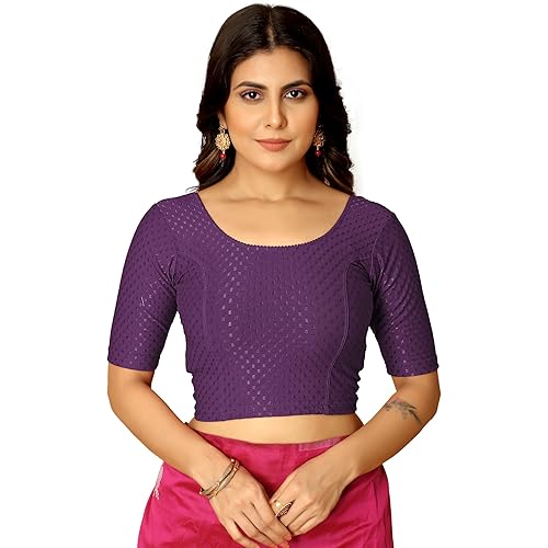 Amazon Brand – Anarva Round Neck Dobby Cotton Lycra Stretchable Elbow Half Sleeve Readymade Saree Blouse for Women Stylish