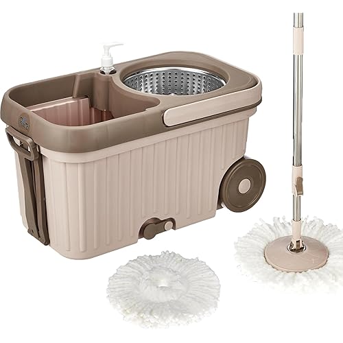 Amazon Brand – Presto! Elite Spin Mop with Steel Wringer and Auto-fold Handle, Chestnut, 2 Refills