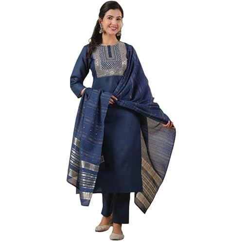 Anekha Women’s Cotton Blend Yoke Embroidery Straight Kurta Set