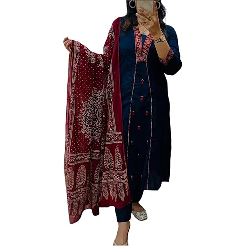44599 reviews for ANNI Designer Navy Blue Pure Cotton A-Line Kurta Pant Dupatta Set for Women | Embroidery 3 Piece Suit with Straight Pants & Matching Dupatta | Festive Office Ethnic Wear