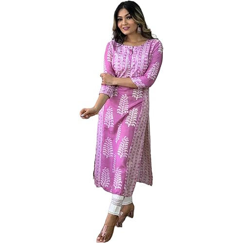 Kurta Fabric: Rayon || Kurta Color :- Pink Style: Straight || Length: Calf Length || Sleeves: 3/4 || Kurti : Length – 46 inches || Pant : Length – 36 inches This set includes: 1 Kurta || Work : Printed || Neck Style:- Round Neck Occassion: Traditiona… read more